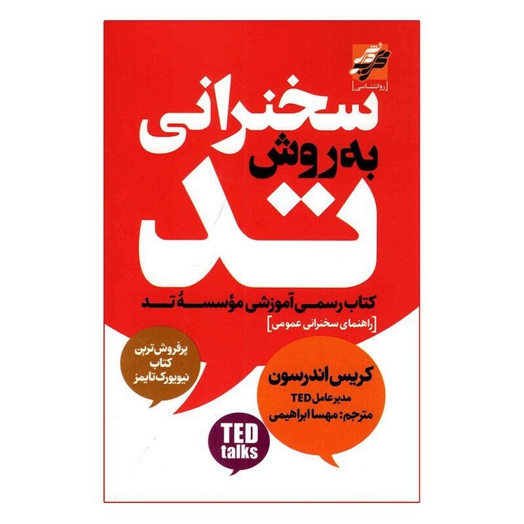 کتاب اصول سخنرانی و فن بیان به روش TED اثر:کریس اندرسون ترجمه: مهسا ابراهیمی معرفی : این کتاب توسط مدیر عامل تد، در سال ۲۰۱۶ در فهرست پرفروشترینهای نیویورک تایمز قرار گرفت. این کتاب دستورالعمل جدید قرن 21 برای ایجاد ارتباطات مؤثر است. امروزه یکی از شناخته شدهترین محافل سخنرانی دنیا TED است. بیشک بسیاری از ما، حداقل یک بار، یکی از ویدئوهای پر ارزش تد را دیدهایم. بسیاری از بزرگان سیاست و اقتصاد دنیا و یا برندگان جایزه نوبل در این برنامه، سخنرانی کردهاند. سخنرانیهایی که به صورت رایگان در سایت تد وجود دارد و بسیاری از آنها با زیرنویس ارائه شدهاند.